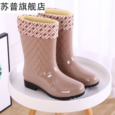 Mang giày bốt nữ phong cách Hàn Quốc, giày nhung ngoài trời bình thường cộng với giày đi mưa bên trong bằng nhung, giày ống giữa nữ, giày nước, áo mưa ống cao người lớn - Rainshoes