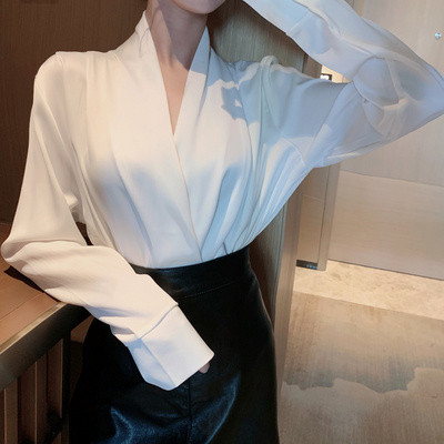 Mùa thu 2019 thiết kế mới ý nghĩa áo sơ mi rộng màu rắn rách cổ chữ V dài tay áo voan nữ hàng đầu - Áo sơ mi chiffon ren