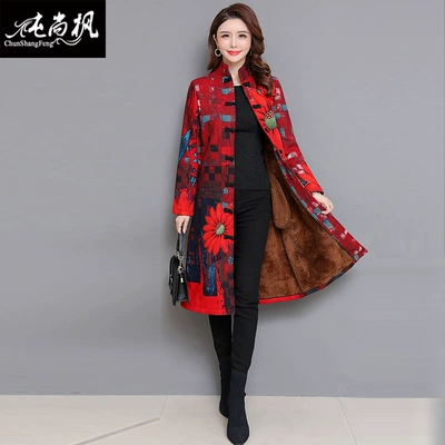 Mùa thu đông 2019 áo khoác cotton mới nữ phong cách quốc gia kích thước lớn nữ trung và cotton dài cộng với áo khoác nhung dày - Trench Coat