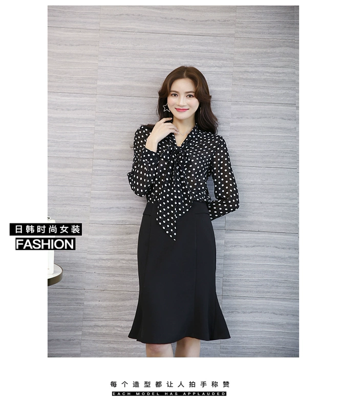 Mùa xuân mới của phụ nữ áo sơ mi dài tay của phụ nữ thắt nơ lỏng màu đen và trắng chấm bi áo sơ mi voan trên cùng - Áo sơ mi
