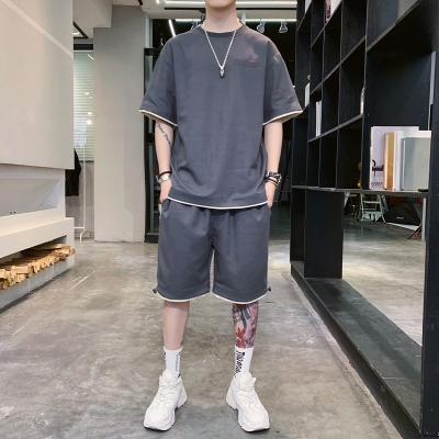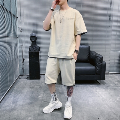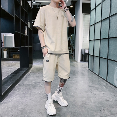 Nam giới áo thun ngắn tay mùa hè bộ đồ thể thao vải lanh giản dị của nam giới bộ đồ hai mảnh vải cotton và vải lanh mỏng nửa tay lỏng lẻo - Bộ đồ