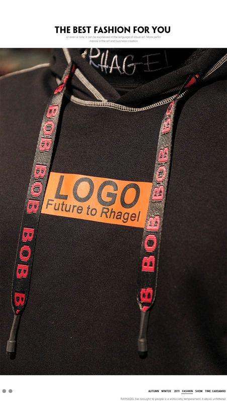 Rehagel 2019 thu đông mới màu đen cộng với áo len trùm đầu nhung cộng với chất béo cộng với size áo khoác nam hợp mốt - Áo len