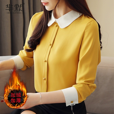 Tây xuân thu đông cộng với áo sơ mi voan nhung ấm áp áo sơ mi dài tay nhỏ nhẹ nấu chín cổ áo búp bê của phụ nữ - Áo sơ mi chiffon ren